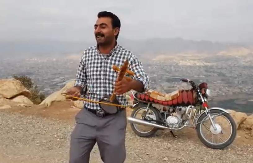 We’re at the Zawa mountain in Iraqi Kurdistan, with a great view over the entire city of Duhok. As we walk down the mountain a motorcycle approaches and the rider jumps off when he sees us and picks up his instruments. Then he asks our guide, Roj, what his name is and then continues to sing the song shown on the following video.
